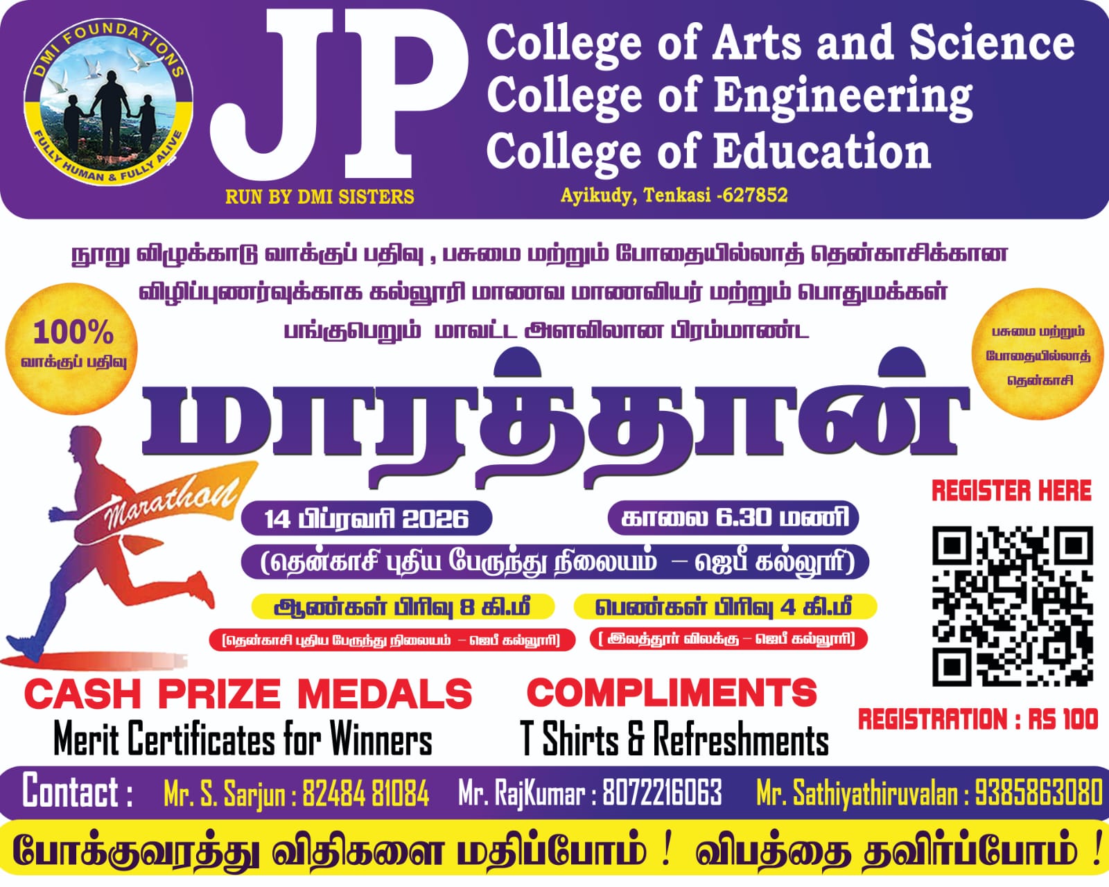05 Feb, 2026 | Read MoreJP College of Arts and Science has been functioning from 2007 under the management of Grace Swaminathan Educational & Charitable Trust. This is a co-educational institution approved by the Government of Tamilnadu and affiliated to Manonmanium Sundaranar University, Tirunelveli. The institution is located in a sprawling area of about 50 acres of land between Tenkasi and Ayikudi Town Panchayat, in Tenkasi District. The college is situated in an evergreen environment emanating peace and tranquility creating an atmosphere conducive for learning.